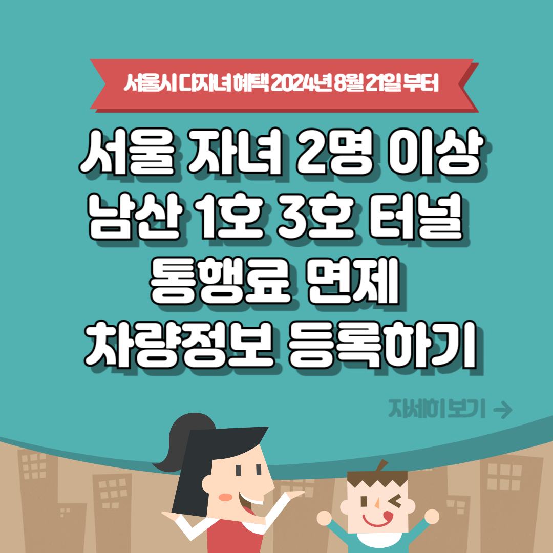 2명 이상 다자녀 가구인 서울시민들은 남산 1호, 3호 터널 혼잡 통행료를 8월 21일부터 면제받을 수 있으니까 그전에 미리 차량 등록해서 꼭 혜택을 받으시기 바랍니다.