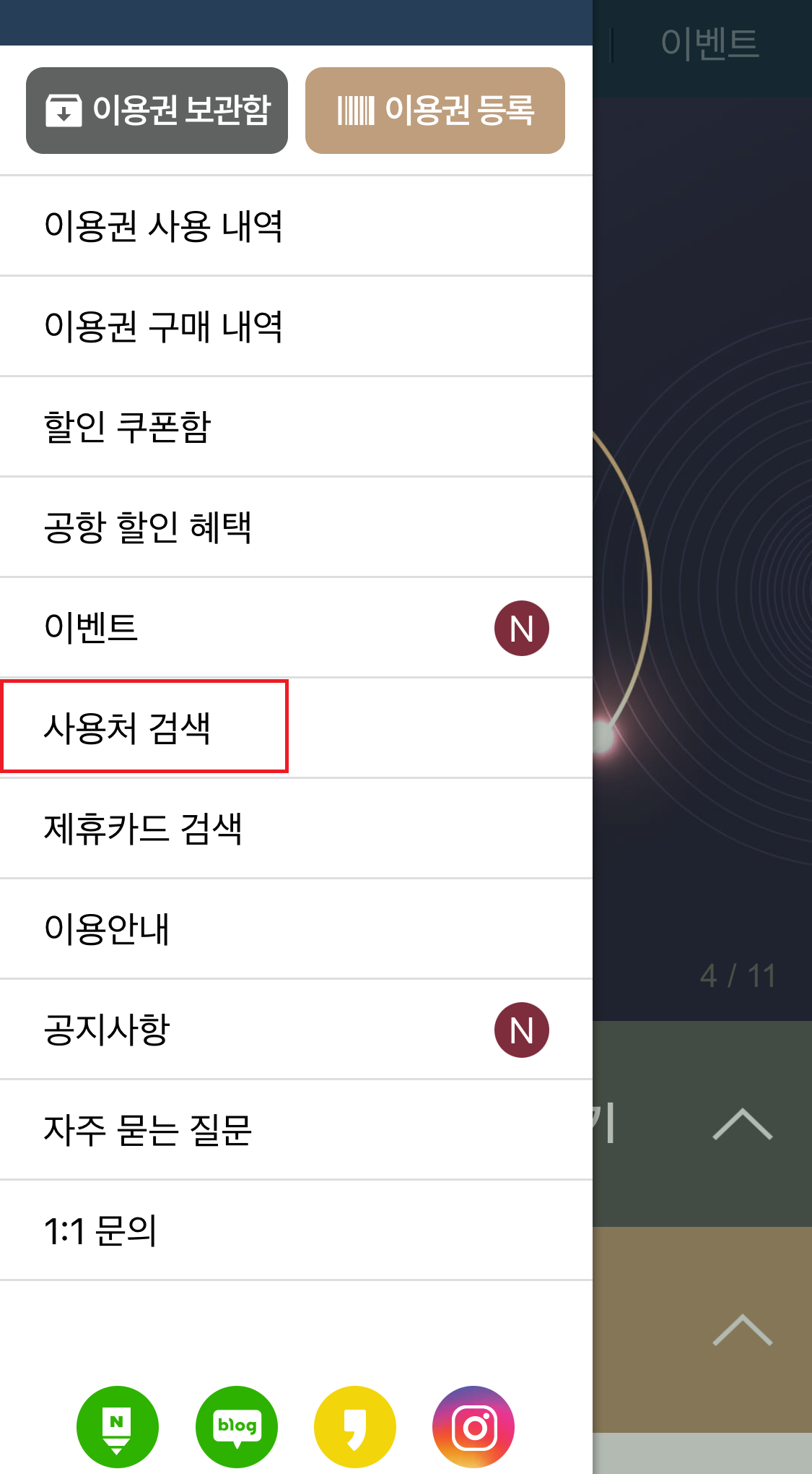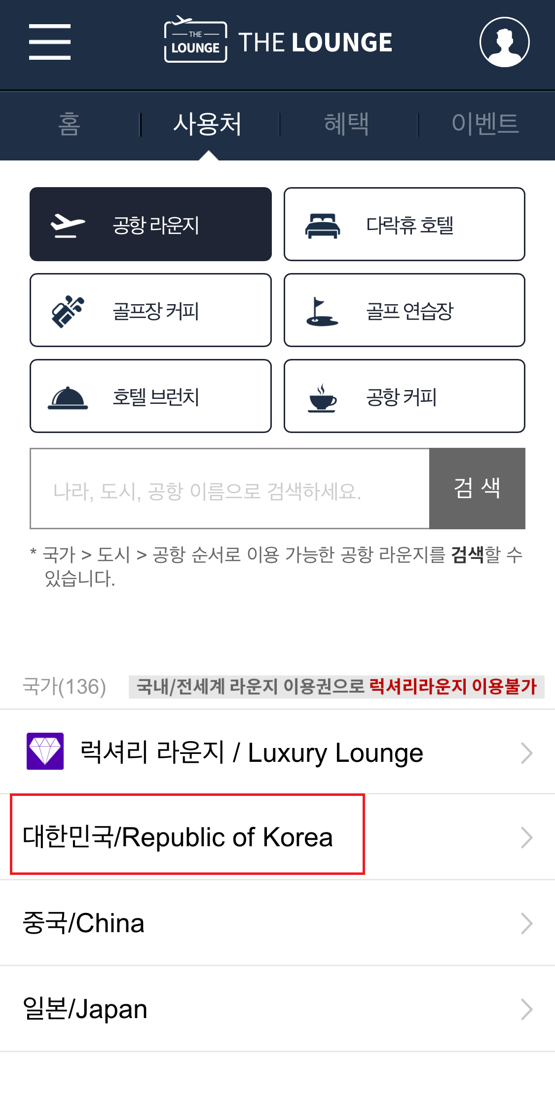 앱에서 상단 메뉴바의 사용처 검색을 누르고 우리나라를 선택한 후 공항을 선택하면 이용할 수 있는 라운지가 나옵니다.