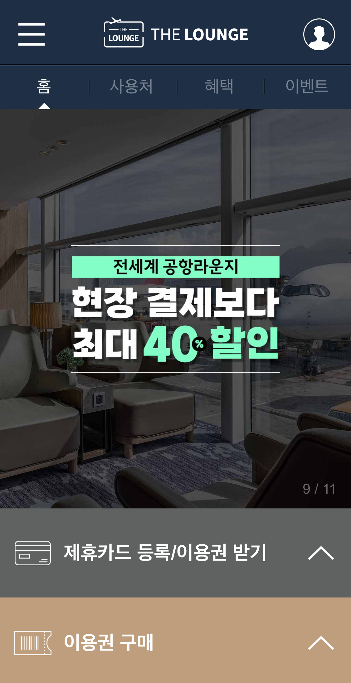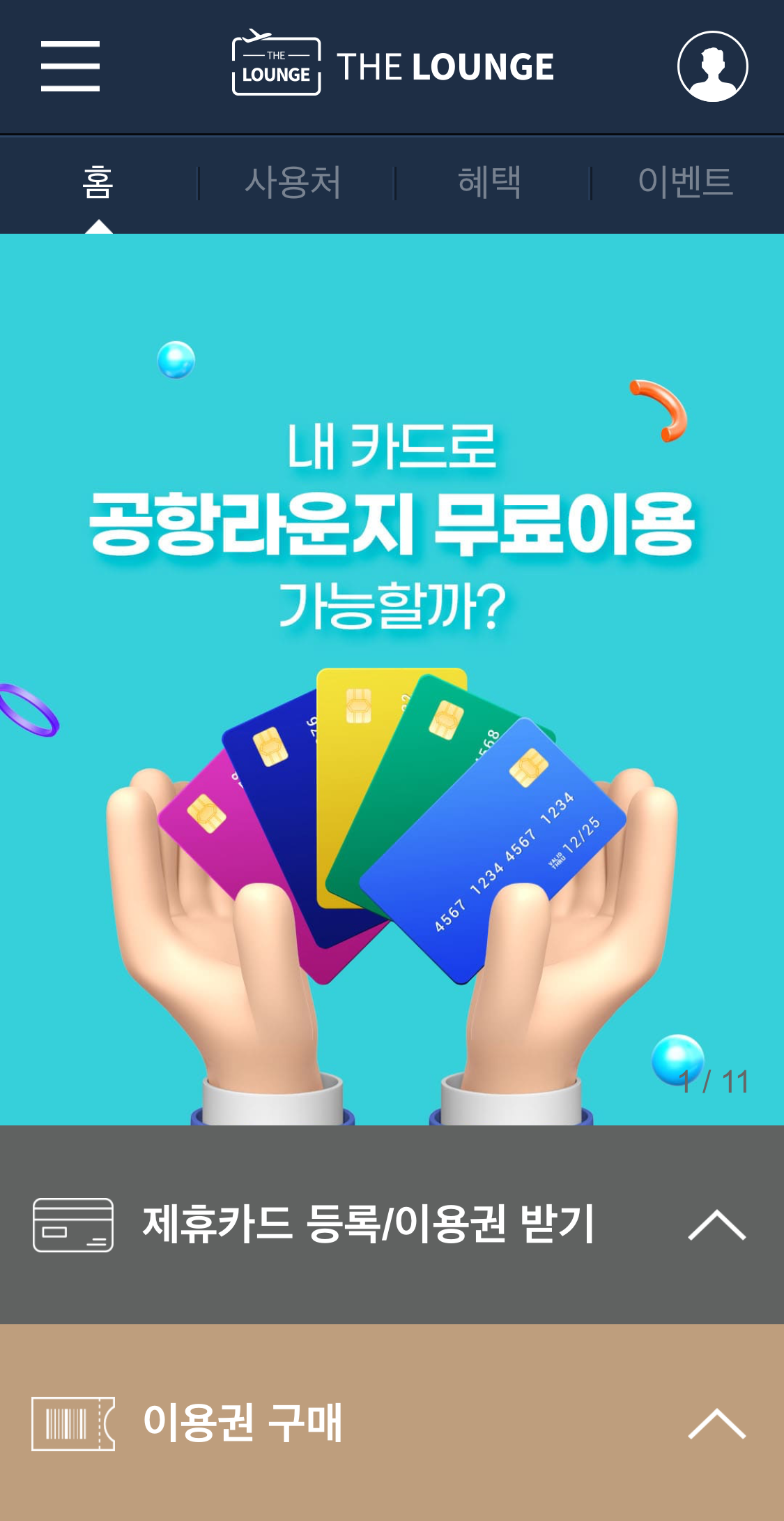 무료 제휴카드를 갖고 있는 분들은 앱에서 카드등록을 하고 공항라운지 이용권을 다운받으면 됩니다.