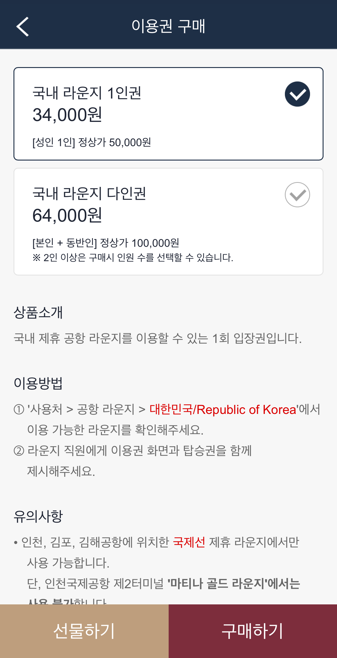 인천공항 제2터미널 마니타 라운지 이용권 구매하기를 해보았더니, 성인 1인당 5만원을 3만 4천원에 구매할 수 있고