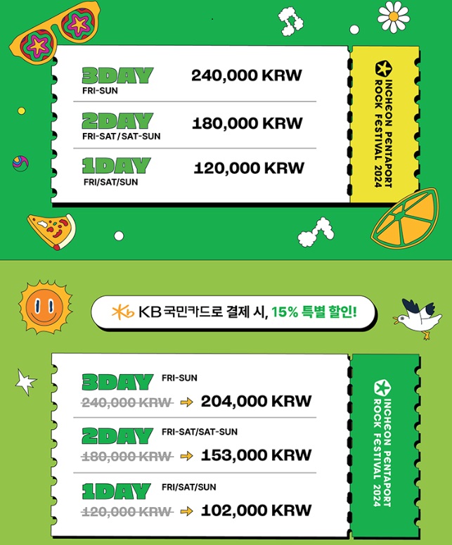 2024 인천 펜타포트 락페스티벌 가격은 1일권, 2일권, 3일권이 있고 KB국민카드로 결제시 15% 할인을 받을 수 있습니다.