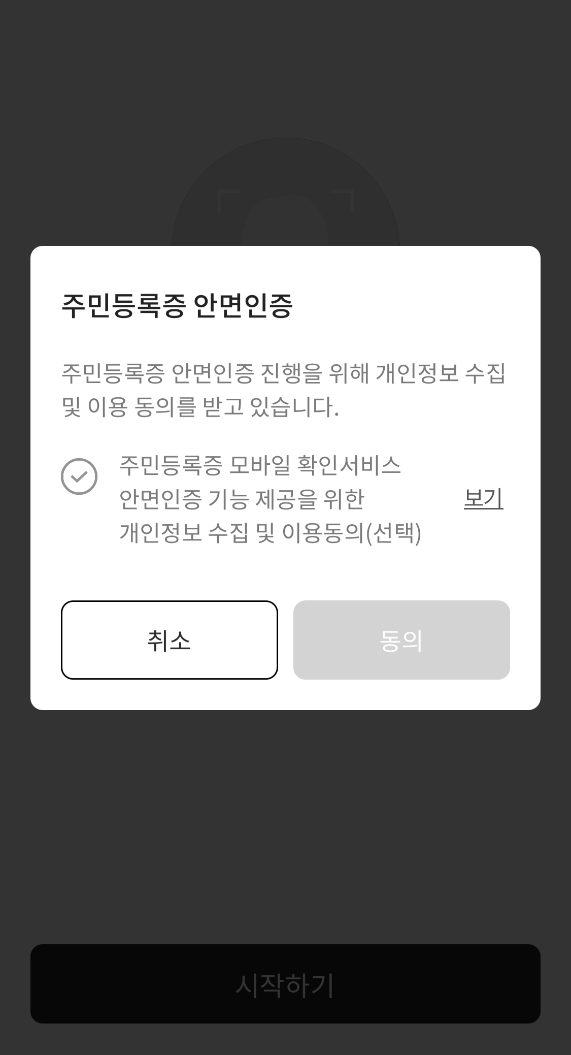 안면인증을 할 때, 개인정보 수집동의가 선택사항처럼 나오는데 꼭 동의를 해야 모바일 신분증을 발급할 수 있습니다.